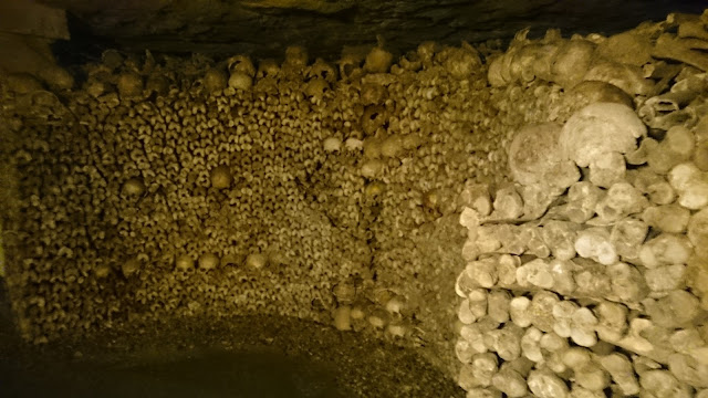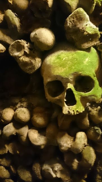 Jos aiot mennä tutustumaan Pariisin katakombeihin varaa lippusi hyvissä ajoin. Olin erään kerran jo varaamassa lippuja, mutta jostain syystä se jäi tekemättä. Lippunsa varanneet kävelivät katakombeihin suoraan sisään. Netissä lukee, että maksimissaan odotusaikaa on kaksi tuntia. Valetta. Päivä ei ollut mitenkään erityisen aurinkoinen ja välillä satoi ihan kunnolla, mutta silti jono alkoi siitä mihin se loppuikin. Jonotimme ruhtinaalliset neljä tuntia, jonka takia jäi elokuvamuseossa käynti välistä. Suvin jonotusaika meni pelkkään pönötykseen, itse kiersin muutaman kerran jonon ympäri ja laskin paljonko ihmisiä on meidän takana ja paljonko edessä. Turvallisuussyistä katakombeissa on ihmisiä kerralla vain parisensataa, siksi ihmisiä otettiin sisään sykäyksin..