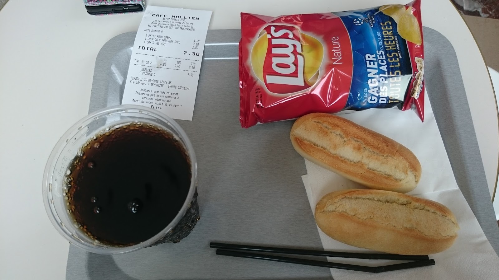 | Vegaanin pärjäämislounas Louvren tapaan. Koskaan ei ole sipsit ja kola maistuneet yhtä hyviltä. |